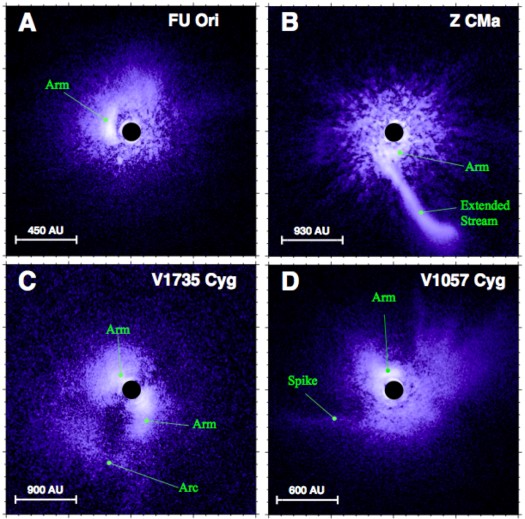 Subaru-teleskoopilla tutkittiin neljää FU Orionis -tyypin tähteä, jotka sijaitsevat 1500–3500 valovuoden etäisyydellä meistä. Kuvat paljastivat yllättäviä ja erikoisia rakenteita, jollaisia ei koskaan aiemmin ole nähty nuorilla tähdillä. Yhtä tähteä ympäröivässä ainekiekossa erottui pitkulainen ainekeskittymä, toisilla erottui piikkiä muistuttavia ohuita rakennelmia ja yhdellä kaarimainen ainekeskittymä.