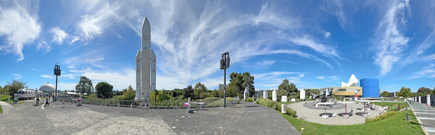 - Vapaasti kierrettävät näyttelyt (4 kerrosta) ja puutarha, mm. Ariane 5 -raketin täysikokoinen malli, Mir-avaruusaseman kaksoiskappale, Sojuz-alus ja Apollo-ohjelman kuulaskeutumisalus LM