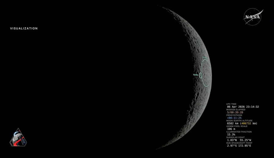 [2.02] Orion-alus saavuttaa lähimmän etäisyytensä Kuusta näillä hetkillä ja on arviolta 6 545 kilometrin korkeudella Kuun pinnasta.