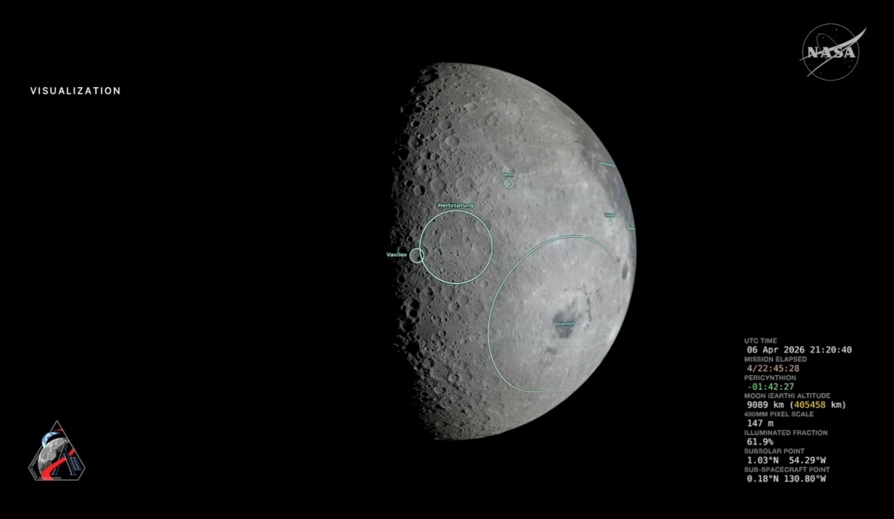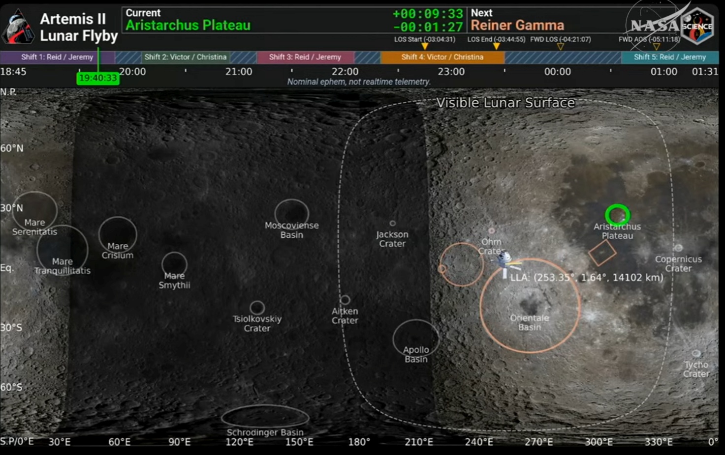 [22.45] Nasa esittelee simuloitua Kuun pinnan karttaa, johon on merkitty miehistön tällä hetkellä näkemä alue (valkoinen katkoviiva). Aluksen sijainnin projektio on merkitty Kuun pinnalle. Orientale Basin eli Mare Orientale, suomeksi Kuun Itäinen meri, erottuu maapallolta nähtynä vain Kuun reunalla. Lennon miehistön näkökulmasta se hallitsee näkymää Kuun valaistulla päiväpuolella.
