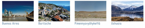 Kuljetus Barilochen lentokentälle, lento Buenos Airesiin ja jatkolento Suomeen.