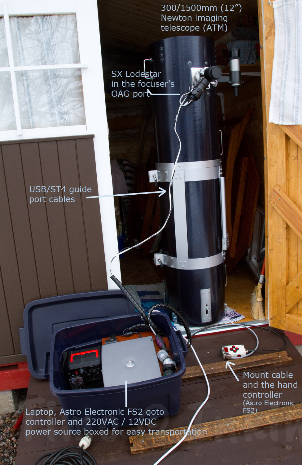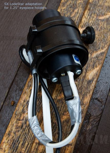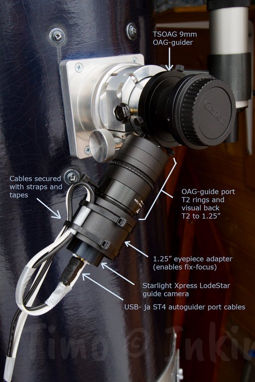 Toisessa kuvassa on Loden kiinnitys tarkennuslaitteeseen. Lodestar on 1.25" kokoinen putkilo, joka uppoaa tavalliseen 1.25" tarkennuslaitteeseen vaikka kokonaisuudessaan. Tämän takia sen tarkennukseen ei tarvittaisi tuollaista määrää erilaisia T2-loittoja OAG-portin etäisyyden säätämiseen, ainoastaan 1.25" visual back olisi riittänyt sopivan pitkän T2 loiton kera, niin tuon olisi voinut säätää fokukseen vaivattomasti okulaaripitimessä liikuttaen. Minulla on tuossa nyt lisänä erillinen 1.25" okulaaripidin, jonka olen kiinnittänyt Lodeen oikealle etäisyydelle rajoittimeksi, jolloin tarkennus löytyy helposti kun vain asentaa kameran OAG-portin okulaaripitimessä pohjaan saakka. Nippusiteet ja teipit tarvitaan kaapelien vedonpoistoon, sillä USB/ST4 liittimet ovat turhan hentoja käytössä ja pakkasessa jäykistyvät kaapelit irtoavat muutoin runkoliittimistään (tämä on laitteen heikoin puoli!).