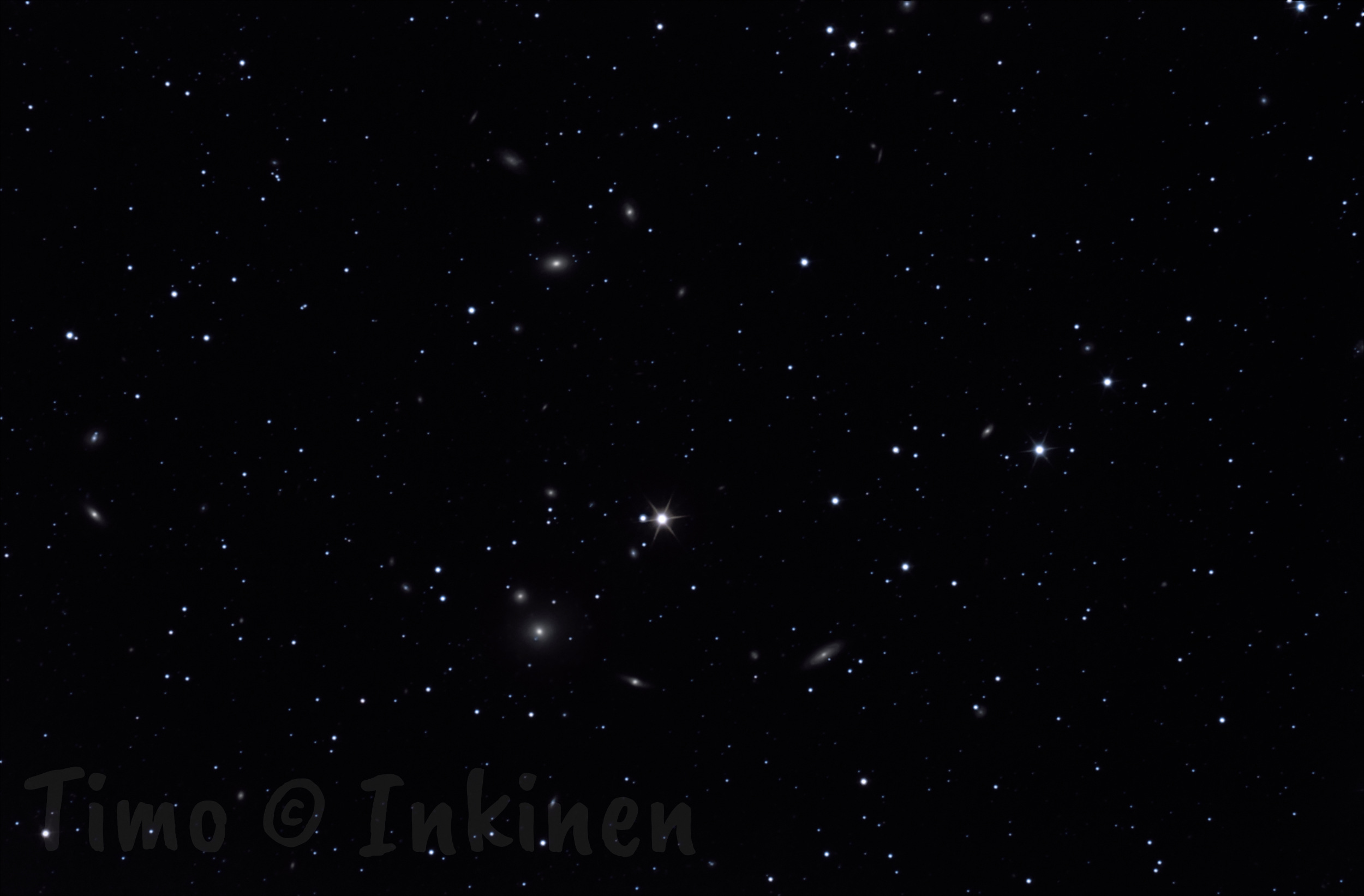 Kuvassa näkyvältä 45' x 34' taivasalueelta löytyy kymmeniä galakseja, joista kirkkaimmat ovat NGC 507 (11.2 mag, keskellä alhaalla), NGC 499 (12.0 mag, keskellä ylhäällä), NGC 494 (14mag, spiraaligalaksi oikealla alhaalla) ja NGC 517 (13mag, vasemmassa reunassa). Näiden lisäksi alueelta löytyy helposti noin 30-40 muuta himmeätä 14-18 magnitudin galaksia, jotka erottuvat sumu/ututäplinä tähdistä. Näitä voi tunnistaa käyttämällä apuna vaikka TriAtlas Projectin Set C tähtikartastoa, jonka lehdeltä 167 tämä ryhmä löytyy. Galaksien kirkkaustietoja voi etsiä esim. SkyFactory's Deep-Sky Catalogue luettelosta, mistä löytyy galakseja noin 16 magnitudiin saakka (kuvassa on tosin tätä selvästi himmeämpääkin materiaalia  :angel:) Yleisesittely tästä NGC 507 galaksiryhmästä löytyy täältä.