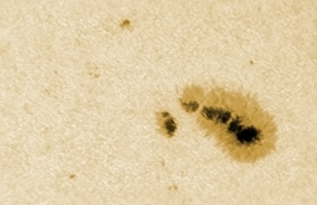 Itselläni huikeita vaikeuksia sekä tarkentaa että saada kuvaa rauhoittumaan 11.5. "Epäloogisesti" kun on älyttömän kaunis päivä, aurinko paistaa ja linnut livertää niin ei olettaisi että ilmakehä on kovin rauhaton. Tuskaisan puserruksen jälkeen tässä on kaikki mitä jäi käteen. Osasuurennus pilkkuryhmästä 1745.