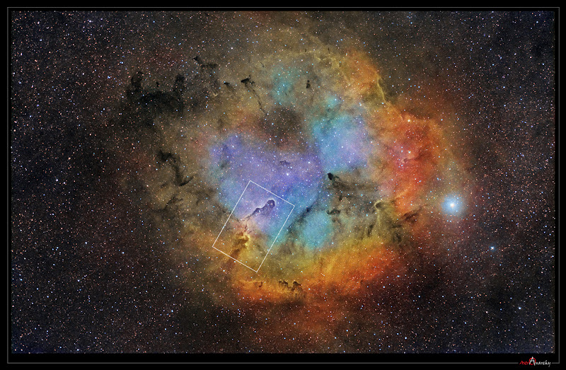 Kuvan alue merkittynä laajakuvaversioon IC 1396 alueesta. Kuvan leveys on n. kolme astetta. (Kuusi täysikuuta mahtuisi rinnatusten.)