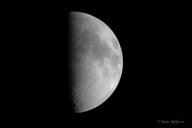 Puolikas Kuu loisti illalla ohuehkon yläpilvisyyden läpi, jonka häiritsevästä vaikutuksesta kuitenkin pääsi pienen käsittelyn jälkeen eroon: