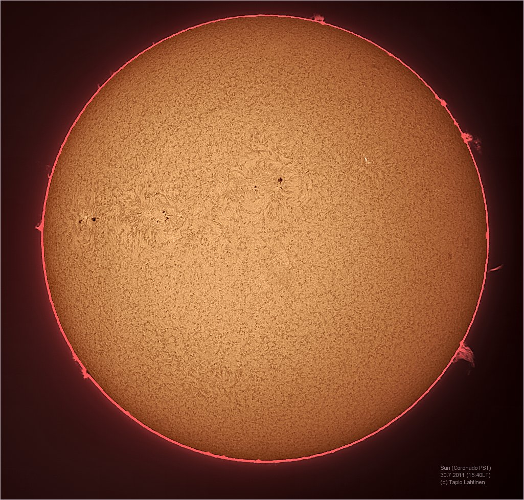 Tässäpä vielä varsinkin einarille oulussa 31.7 polttotasolta kuvattu aurinko pilkkuineen joka ei ole vihreä ,kalustona Sw mc-127 , barlow 2x , nikon 3100 , iso 100, 1/200 s ,astrosolar kalvo. Kuvankäsittely picasa 3 ohjelmalla.