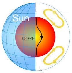 Viereisessä kuvassa keltaiset nuolet kuvaavat Auringon sisällä liikkuvia plasmavirtoja. Virrat jakaantuvat pohjoiseen ja eteläiseen osaan sekä muodostavat lenkkejä. Yhteen kokonaiseen kierrokseen kuluu 40 vuotta.