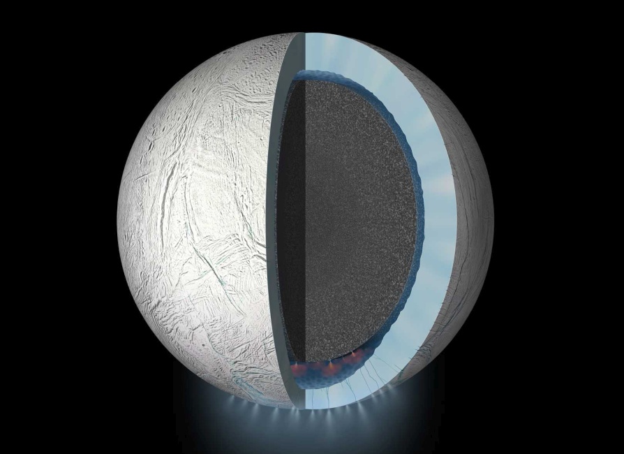 Noin 500 kilometrin läpimittaista Enceladusta tutki aikoinaan Cassini-luotain. Sen mittausten perusteella kuun jääkuori on noin 20 kilometriä paksu ja sen alla on noin 30 kilometriä syvä sulan veden valtameri.