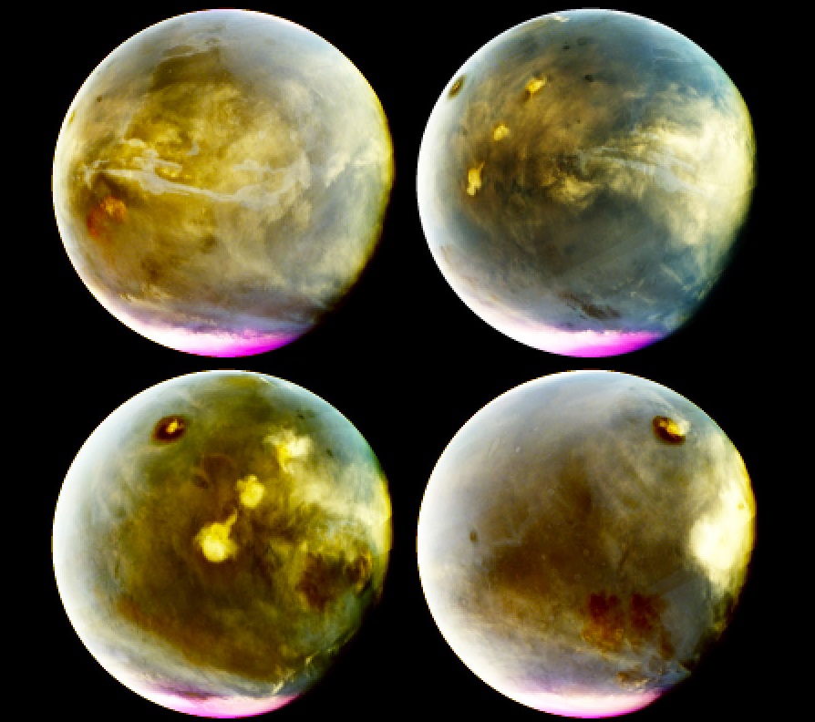 Nasan luotain nappasi yllä olevat kuvat heinäkuussa spektrografillaan, joka taltioi ihmissilmälle näkymättömällä ultraviolettivalon aallonpituudella. Kuvasarjassa pilvet kasvavat tulivuorten ylle seitsemän tunnin aikana, mikä on lähes kolmannes naapuriplaneettamme vuorokaudesta.