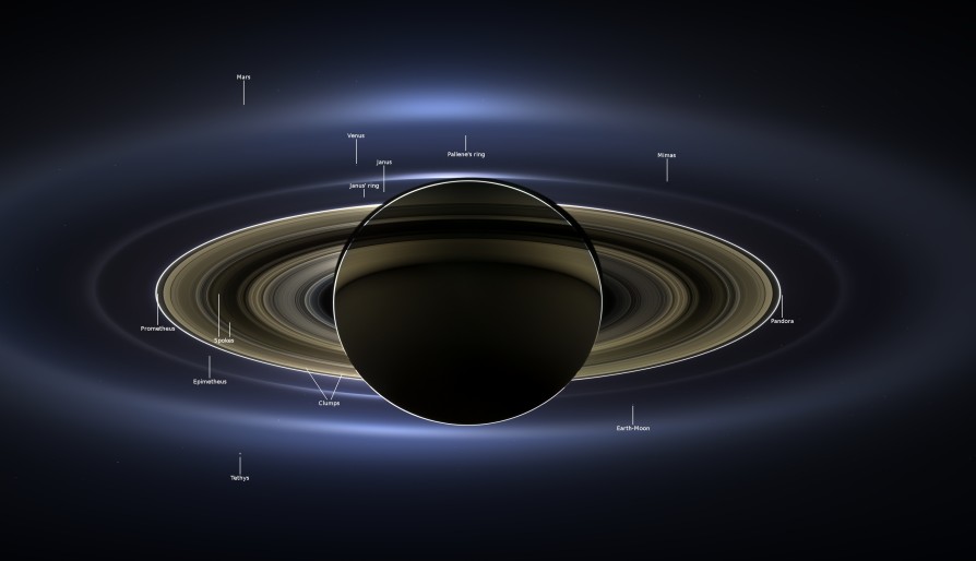 Viereisessä mosaiikkikuvassa näkyvät Saturnuksen ja sen useiden kuiden lisäksi myös maapallo, Venus ja Mars. Jopa kiertolaisemme Kuu on mahdollista erottaa, jos kuvaa suurentaa riittävästi.