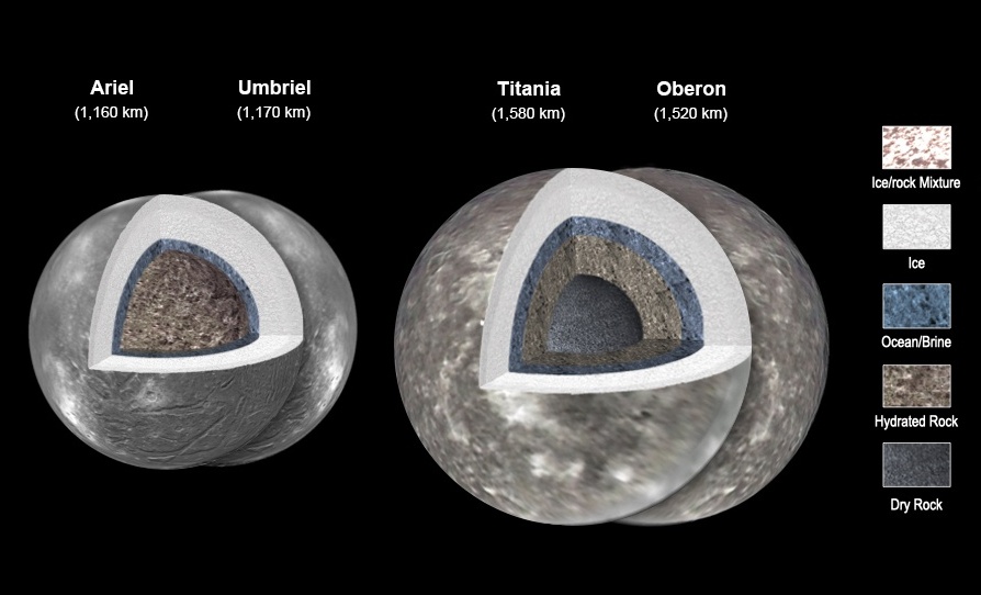 Vesikerroksen sisältävät Oberon, Titania, Umbriel ja Ariel ovat kaikki yli 1 000 kilometriä halkaisijaltaan, kun taas loput kuut ovat alle 500 kilometrin kokoisia.