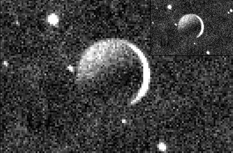 New Horizons otti kuvansa pian Pluton ohituksen jälkeen noin 160 000 kilometrin päästä. Etäisyys on suurin piirtein puolet Maan ja Kuun välimatkasta. Itse Pluto on rajattu juuri kuvan ulkopuolelle.