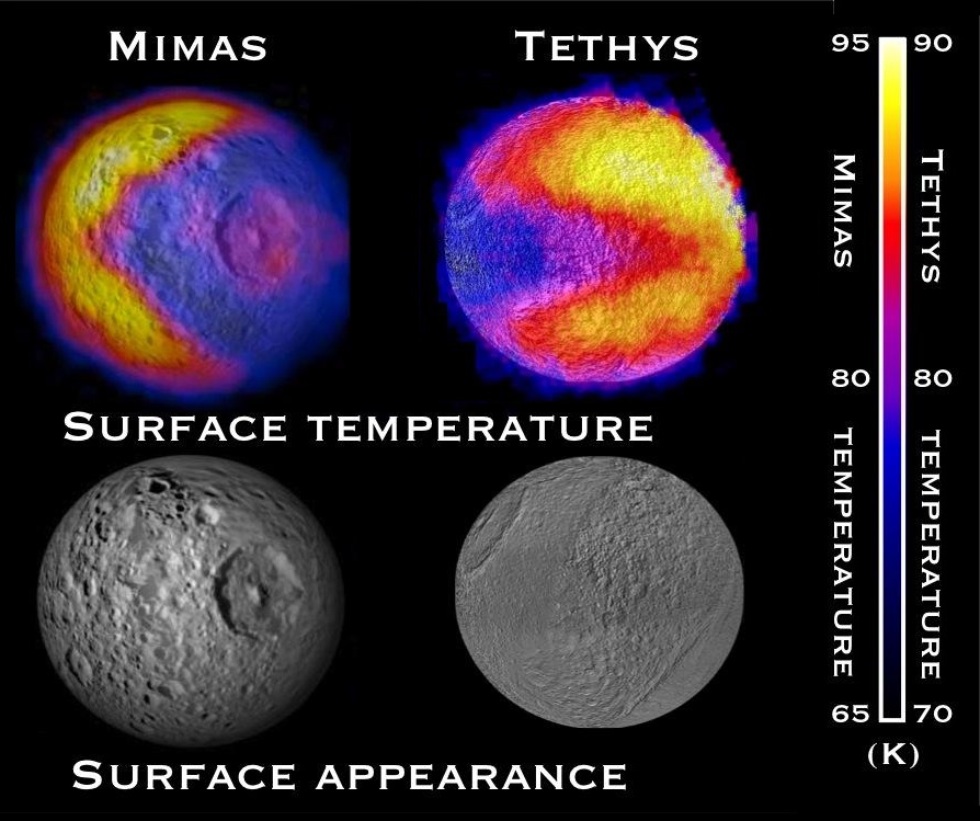Saturnuksen Tethys-kuun pintalämpötila vaihtelee erikoisella tavalla eri puolilla kuuta. Kaksiosainen korkeamman lämpötilan alue muistuttaa Pac-Man-tietokonepelihahmoa.
