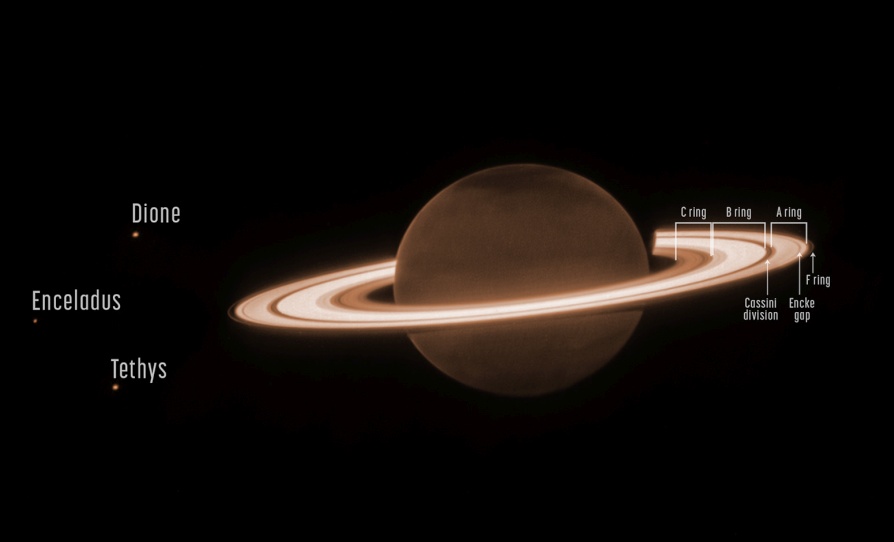 Oheiseen kuvaan on merkitty eri kirjaimilla nimettyjä renkaita, joita erottavat kuiden resonanssista aiheutuvat tummemmat ja tyhjemmät alueet.