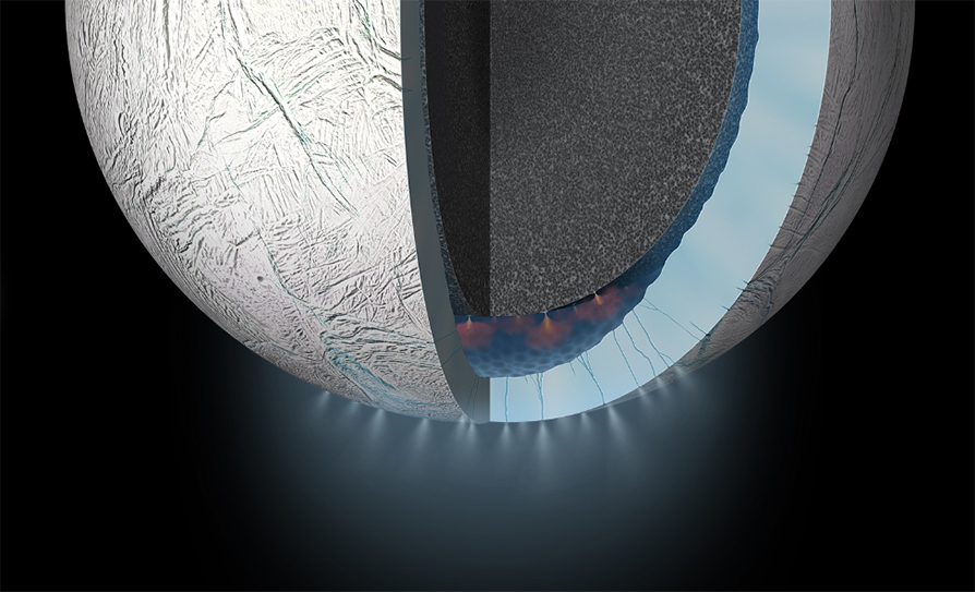 Enceladus on yksi pääasiallisia kohteita elämän etsimiseen aurinkokunnassa, sanoo Christopher Glein Southwest Research -instituutista. Cassini-luotain tunnisti vuonna 2005 kuun etelänavalta avaruuteen suihkuavasta vedestä lähes kaikkia elämän vaatimia ainesosia.