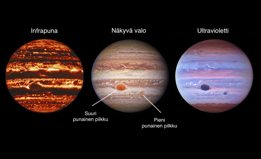 Jupiterin suuri punainen pilkku erottuu infrapunakuvassa suurempana kuin kahdessa muussa kuvassa. Pilkku on valtava myrskykeskus Jupiterin kaasukehässä.