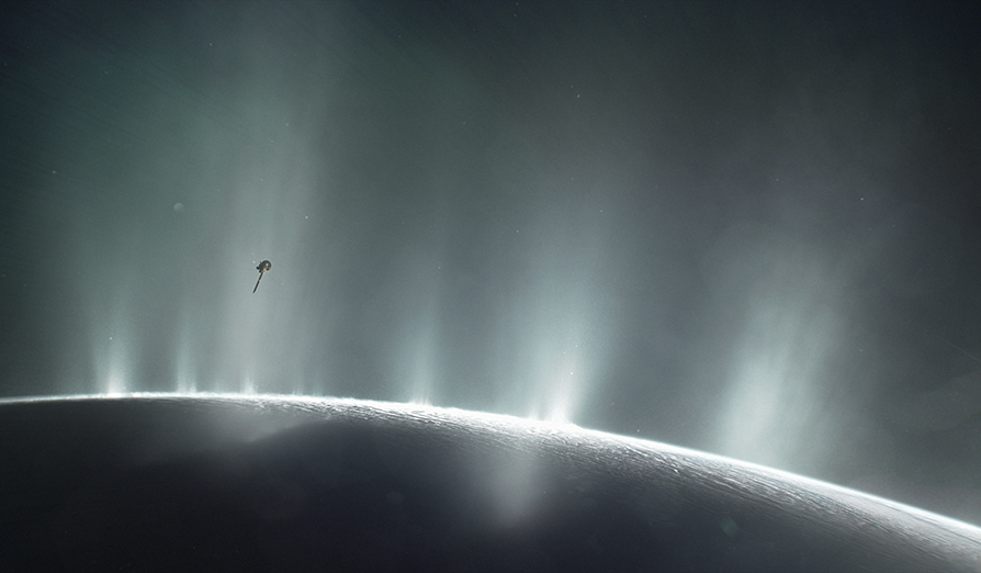 Cassini-luotain lensi Enceladuksen navalta nousevien vesisuihkujen läpi 28. kesäkuuta 2018. Tuolloin se tutki geysir-suihkuja.