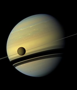 Etualalla komeilee Merkurius-planeettaa suurempi Titan. Kuva on otettu lähes suoraan Saturnuksen renkaiden tasosta. Renkaiden varjot näkyvät planeetan pinnalla.