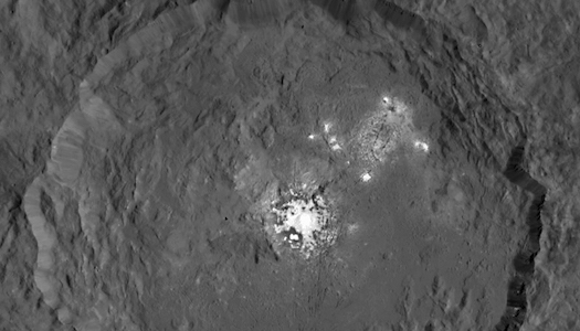 Yllä olevassa kuvassa komeilee Cereksessä sijaitseva törmäyskraatteri Occator. Kirkkaat kohdat ovat melko varmasti pinnan alta esille tullutta vesijäätä tai suolaa. Miten vesi tai suola on tarkalleen ottaen päätynyt pinnalle, on silti vielä mysteeri.