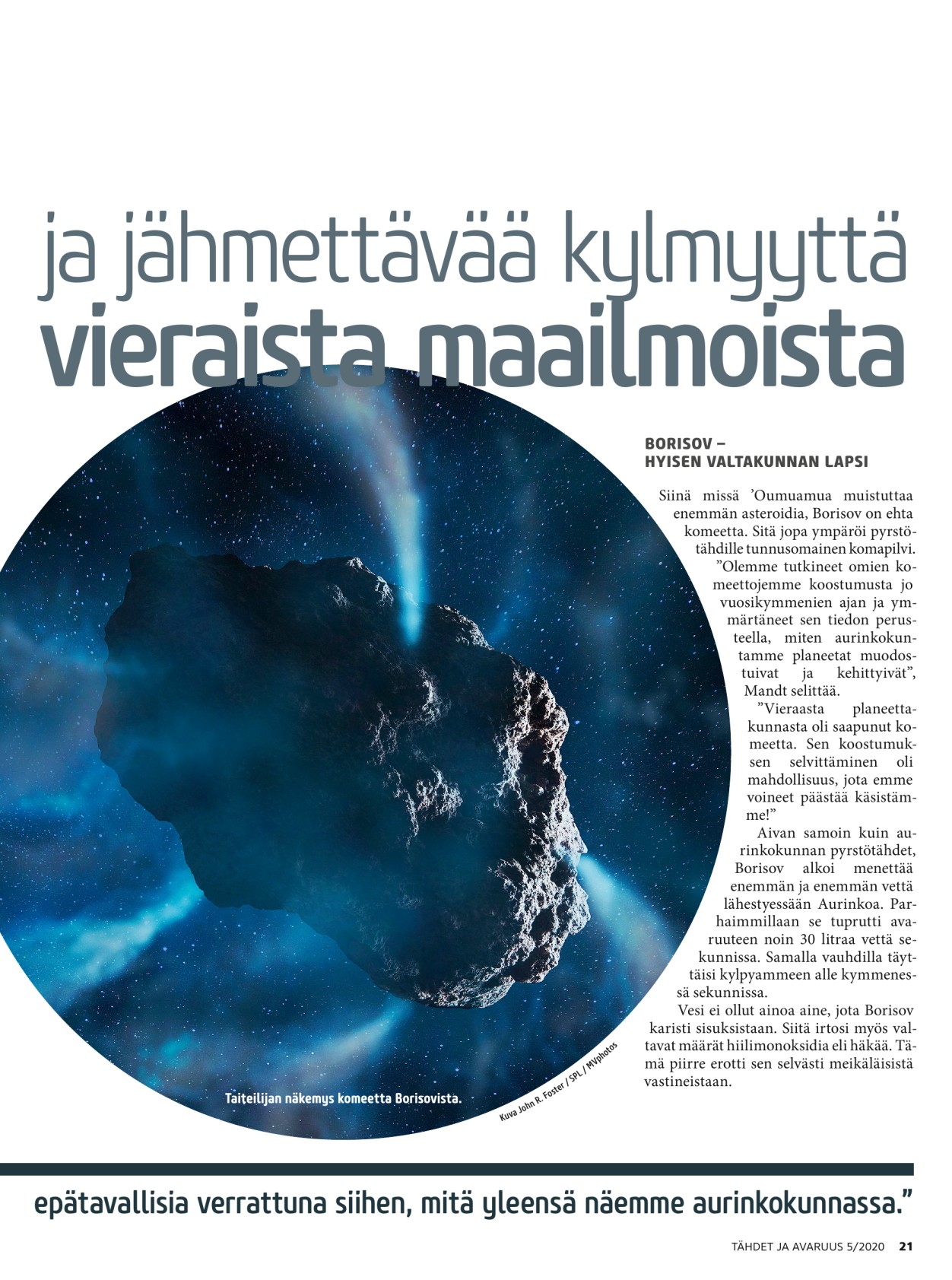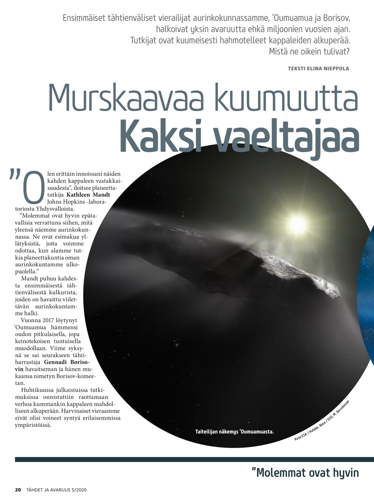 Ensimmäinen aurinkokunnassa vieraillut tähtienvälinen kohde oli vuonna 2017 uutisotsikoihin noussut ‘Oumuamua. Kappale herätti monia polttavan kiinnostavia, mutta avoimiksi jääneitä kysymyksiä esimerkiksi sen muotoon ja erikoiseen kiihtyvyyteen liittyen.