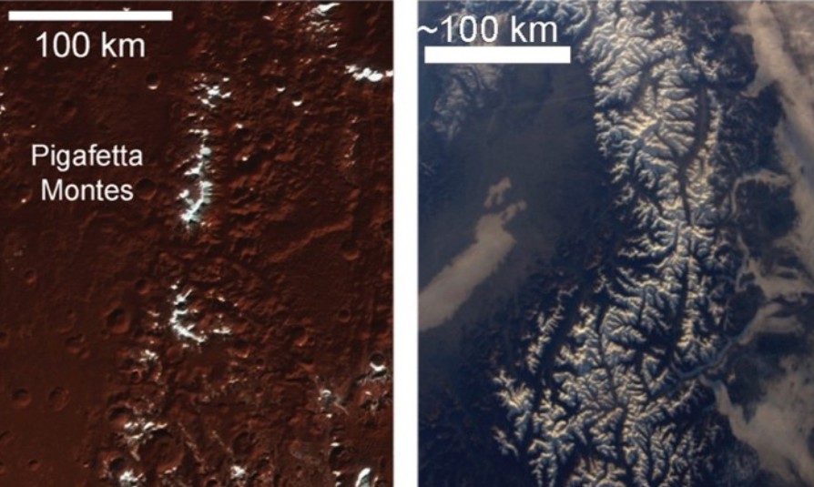 Sekä maapallolla että Plutolla on lumihuippuisina kohoavia vuoristoja. Lumi kuitenkin päätyy vuorten yläosiin aivan eri mekanismien kautta.
