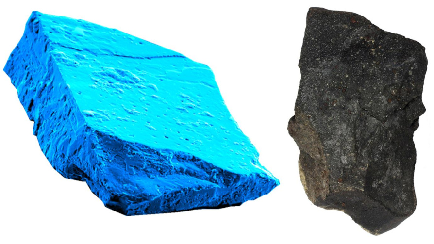 Heckin ryhmän tutkimat mineraalit ovat sinertäviä hiboniittikiteitä, jotka aurinkokunnan muodostuessa joutuivat avaruuskivien sisään.