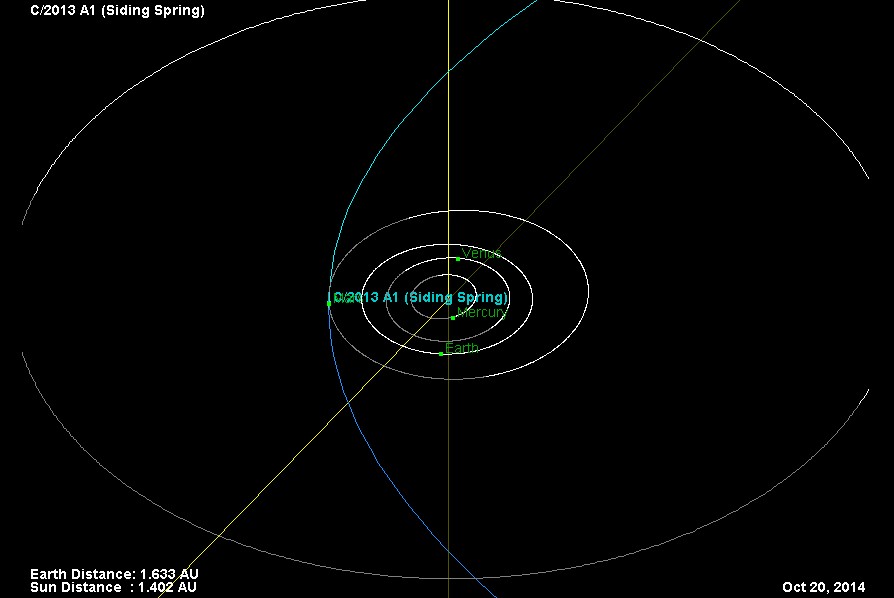 C/2013 A1 on hyperbolisella radalla eli se tulee todennäköisesti ensimmäistä kertaa aurinkokunnan sisäosiin. Komeetta on jo nyt hyvin kirkas ja SpaceObs-sivusto spekuloi sen ytimen olevan jopa hurjat 50 kilometriä halkaisijaltaan.
