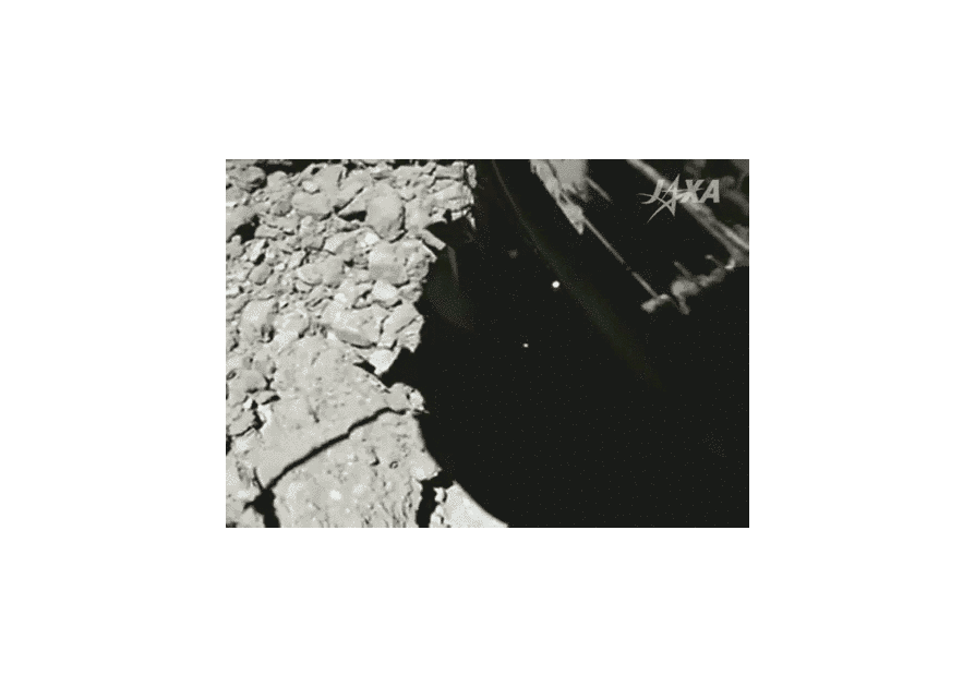 Siinä erottuu luotaimen varjo ja rakettimoottoreiden käytöstä tummaksi muuttunut alue Ryugun pinnalla. Kameran linssiin on myös tullut mustina pisteinä näkyvää pölyä.