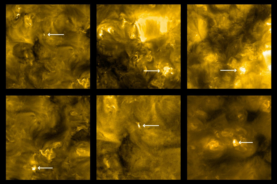 Kuvissa erottuu "leiritulia", jotka tutkijoiden mukaan ovat nähtävästi roihupurkausten paljon pienempiä pikkuserkuksia. Yllä olevassa kuvassa nuolet osoittavat näitä nanoroihuja.