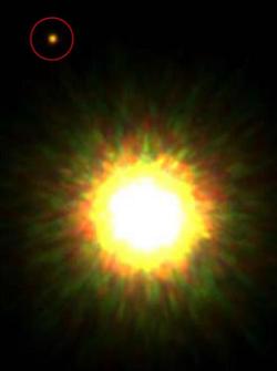 Todennäköisesti ensimmäinen valokuva auringonkaltaista tähteä kiertävästä eksoplaneetasta julkaistiin tänään aamuyöllä. Havaijin Gemini-kaukoputken adaptiivisella optiikalla napattu eksoplaneetta erottuu ympyröitynä kuvan vasemmassa yläkulmassa. Kuvan kirkkain kohde on sen keskus- eli emotähti.