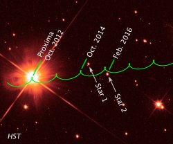 Viereiseen kuvaan on merkitty Proxima Centaurin näennäinen liike taivaalla. Tähden tekemät kiemurat johtuvat Maan liikkeestä Auringon ympärillä. Proxima Centaurin oma kolmiulotteinen liike siirtää sitä Kuun halkaisijan verran taivaalla 600 vuodessa.
