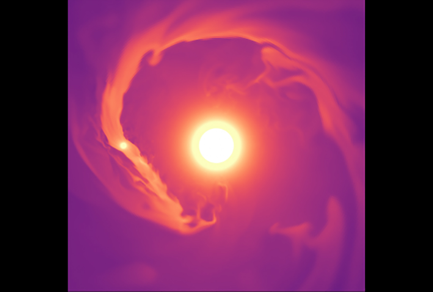 Yllä olevassa simulaatiossa, joka esittää näkymää ratatason yläpuolelta, heliumista koostuva häntä ulottuu lähes kokonaan tähden ympäri. Kaasua puhaltuu myös planeetan kiertosuuntaan nähden sen etupuolelle.