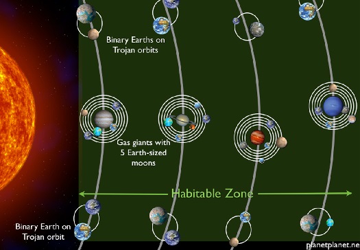 Tämän lisäksi jokaisen kaasuplaneetan radalla on vielä kaksi painovoiman kannalta vakaata paikkaa, jonne voi sijoittaa kaksi toisiaan kiertävää kiviplaneettaa. Näin yksittäisen tähden elämänvyöhykkeelle on mahdollista saada jopa 36 maankaltaista planeettaa.