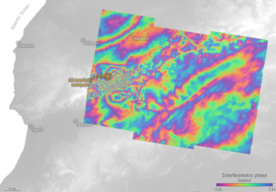 Syyskuun 8. päivänä Marokossa tapahtunut maanjäristys jätti jälkensä maanpinnan korkeuksiin. Eurooppalaisen Sentinel-1A-tutkasatelliitin kuvat visualisoivat muutosalueita.