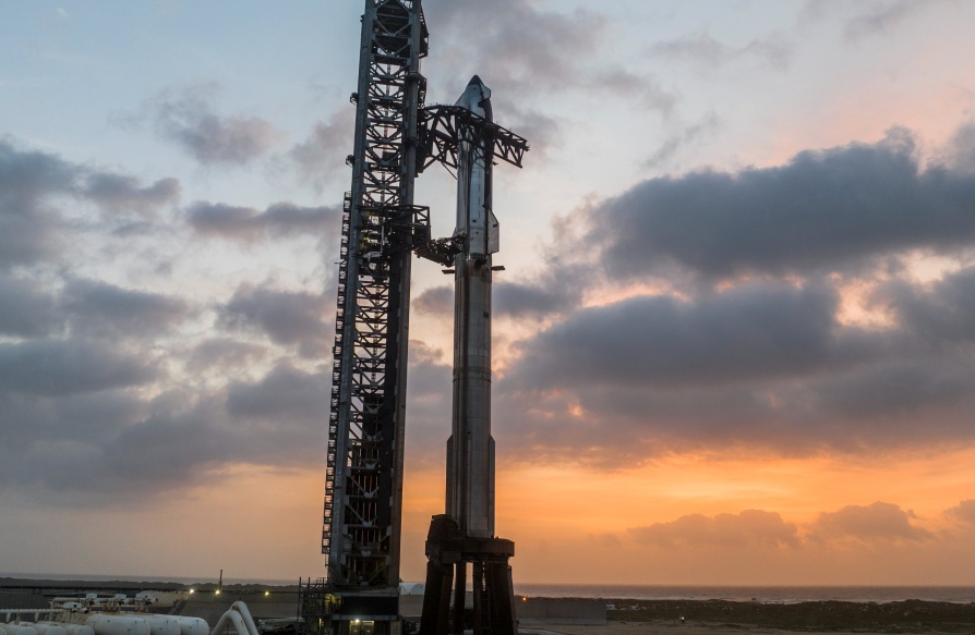 Alempi vaihe, 71 metriä korkea Super Heavy, lentää nyt huollettuna ensimmäistä kertaa uudelleen. Sama rakettivaihe lensi ensimmäistä kertaa Starshipin 7. koelennolla tammikuussa ja laskeutui onnistuneesti.