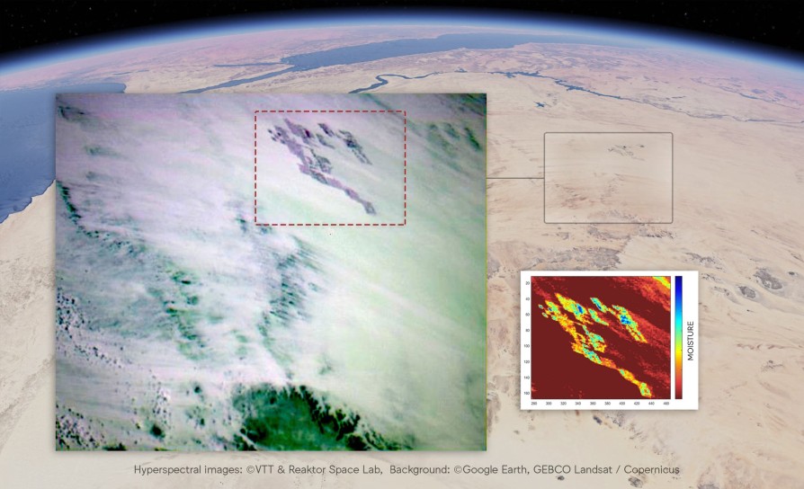 Reaktor Space Lab -yrityksen Hello World -satelliitin ensimmäisessä kuvassa näkyy kasteltu alue aavikolla Etelä-Egyptissä. Satelliitin hyperspektrikameraa käytetään esimerkiksi maaperän kosteusmittauksissa ja geologisissa kartoituksissa.