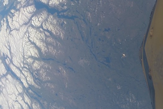 Oheisessa videolta poimitussa kuvassa erottuu Skandien vuoristoa, Torniojärvi ylävasemmalla sekä aivan ylävasemmassa kulmassa vuonon rannalla Narvik. Hyötykuormasta irrotettu raketin ylempi vaihe näkyy sen alla.