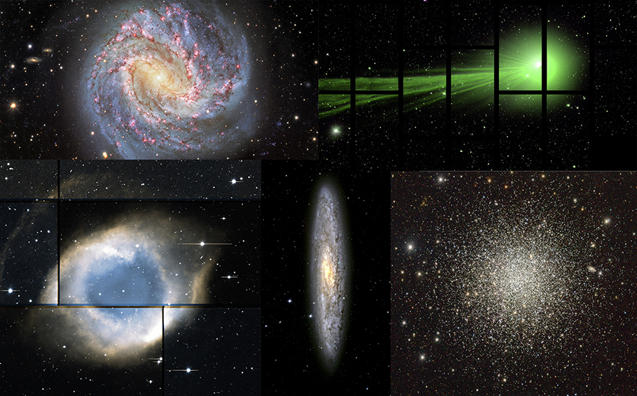 Näistä yllä on poimittuna kaksi galaksia, yksi planetaarinen sumu ja pallomainen tähtijoukko, sekä 2014–15 vaihteessa vieraillut komeetta Lovejoy. Loput kuvat löytyvät alla olevan linkin takaa.