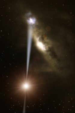 ESOn VLT-teleskoopilla tutkitusta aukosta purkautuva ainesuihku osuu lähistöllä sijaitsevaan galaksiin, jossa se aiheuttaa tähtien poikkeuksellisen runsasta syntymistä.