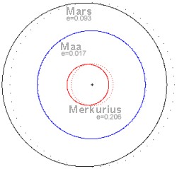 Maan, Marsin ja Merkuriuksen radat (jatkuvat viivat) verrattuina ympyröihin (pisteviivat). Kuvaajaan on merkitty myös planeettojen ratojen eksentrisyys, joka on sitä suurempi mitä kauempana ellipsirata on ympyrästä. Maan rata on hyvin lähellä ympyrää, kun taas Merkuriuksella ja Marsilla radat eroavat huomattavasti. Kuva Brid