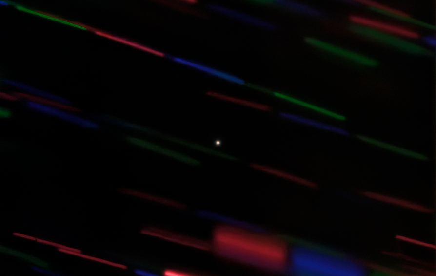 Yllä olevassa Gemini-observatorion kuvassa taustalla olevat tähdet näkyvät kolmena eri värisenä viiruna, koska teleskooppi on liikkunut seuratessaan nopeasti kulkevaa kohdetta. Gemini otti kolme kuvaa eri suotimien läpi värikuvan luomiseksi.