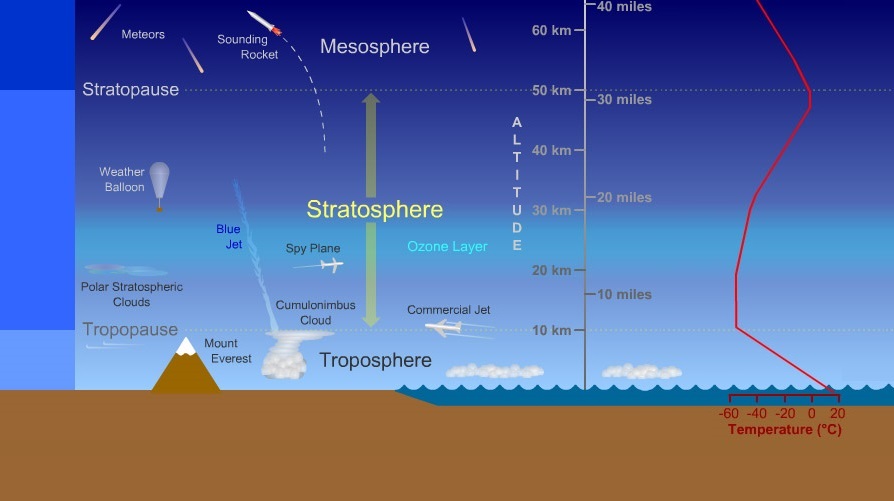 Stratosfääri sijaitsee keskimäärin noin 15-50 kilometrin korkeudella maapallon pinnasta. Lähes kaikki sääilmiöt ja pilvet esiintyvät sen alapuolella.