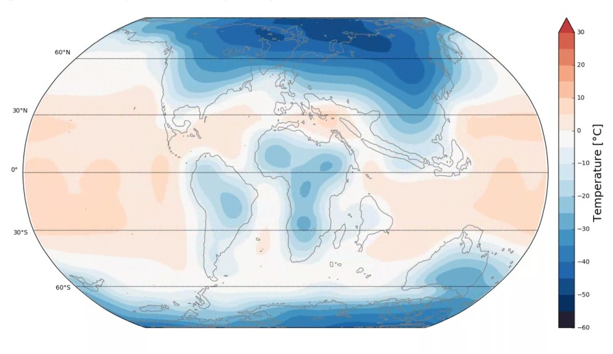 Mallinnuksen mukaan maapallon pinnan keskilämpötila putosi noin 26 celsiusasteella ja pysyi keskimäärin nollan alapuolella noin 3 vuoden ajan. Ilmastolla kesti 30 vuotta aikaa toipua törmäyksestä. Asteroiditörmäyksen aiheuttamaa simuloitua ilmastonmuutosta esitellään animaatiossa.