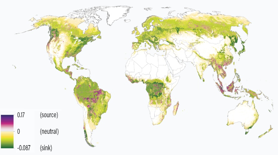Julkaistussa kartassa erottuvat etenkin Brasilian ja Kaakkois-Aasian sademetsäalueilla tapahtuneet metsien hiilivarantojen vähenemiset. Hiilinieluja on näkyvissä etenkin Venäjällä ja Kanadassa.