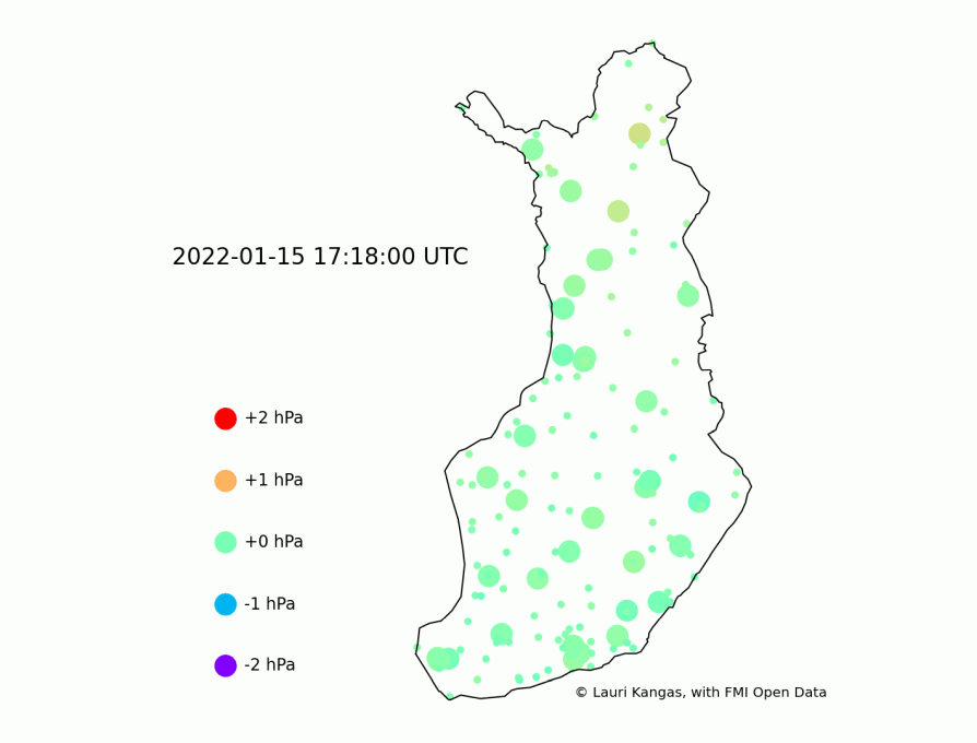 Tyyneltä valtamereltä saapunut paineaalto löytyi ilmanpainemittauksista Suomessa asti. Ursan tulipallotyöryhmän Lauri Kangas teki FMI:n havaintoaineistosta animaation.