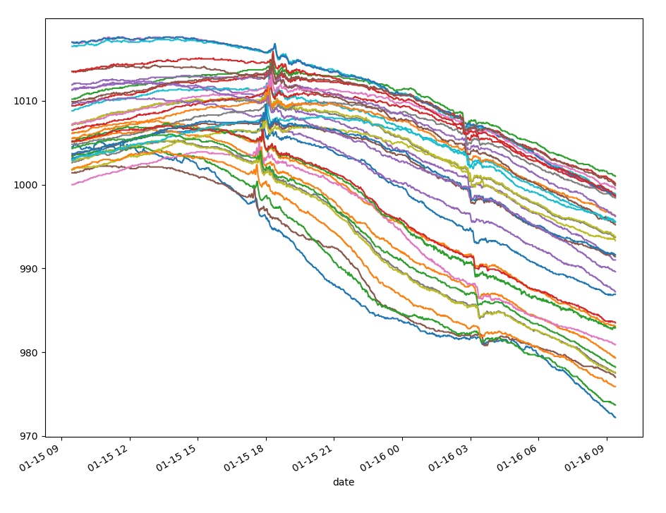 Hän myös piirsi mittausasemien painekäyrät samaan kaavioon. "Käyrissä näkyy sattumalta hieno efekti, kun pohjoisessa oli matalammat ilmanpaineet kuin etelässä, niin sen ansiosta käyrät luonnostaan järjestyivät siten, että aallon eteneminen erottuu", Kangas selittää.