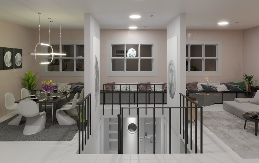 Kuun pienemmän painovoiman takia arkkitehdit halusivat myös tehdä huoneista nykystandardeja korkeampia. Siksi ylemmän kerroksen huonekorkeus on jopa kolme metriä. Ikkunoita olisi vain yhdellä puolella taloa ja ainoastaan yläkerrassa haitallisen säteilyn vähentämiseksi.