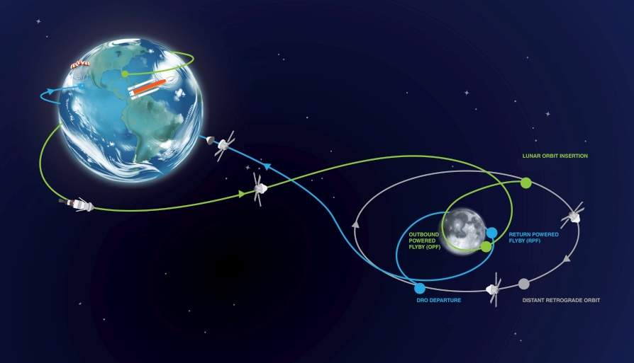 Orion-alus on hetken Maan kiertoradalla ja avaa huoltomoduulinsa aurinkopaneelit. Lisävaihe kiihdyttää aluksen kohti Kuuta ja irrottautuu noin 2 tuntia myöhemmin.