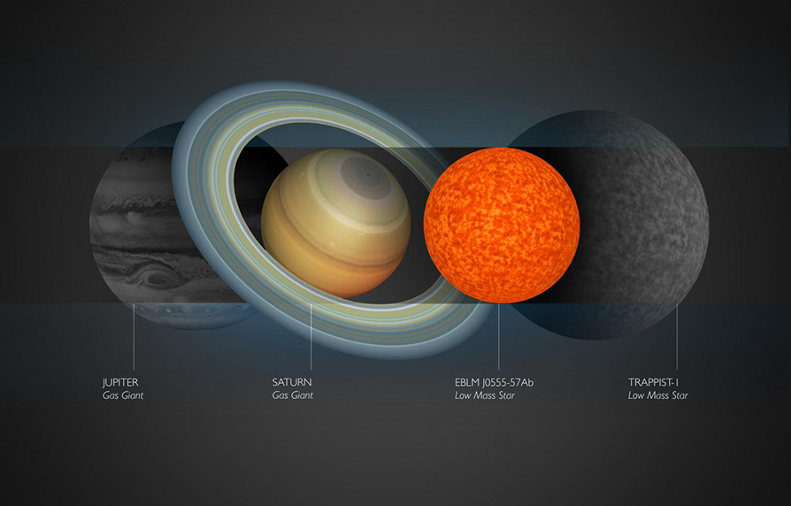 Pikkuruinen tähti, nimeltään EBLM J0555-57Ab, on hiukan Saturnusta kookkaampi, mutta sen painovoima on noin 300 kertaa tätä suurempi (Saturnuksen pinnalla painovoima on puolestaan sama kuin Maassa). Boetticherin mukaan tähti on luultavasti viileämpi kuin useat muista aurinkokunnista löydetyt kaasujättiläiset.